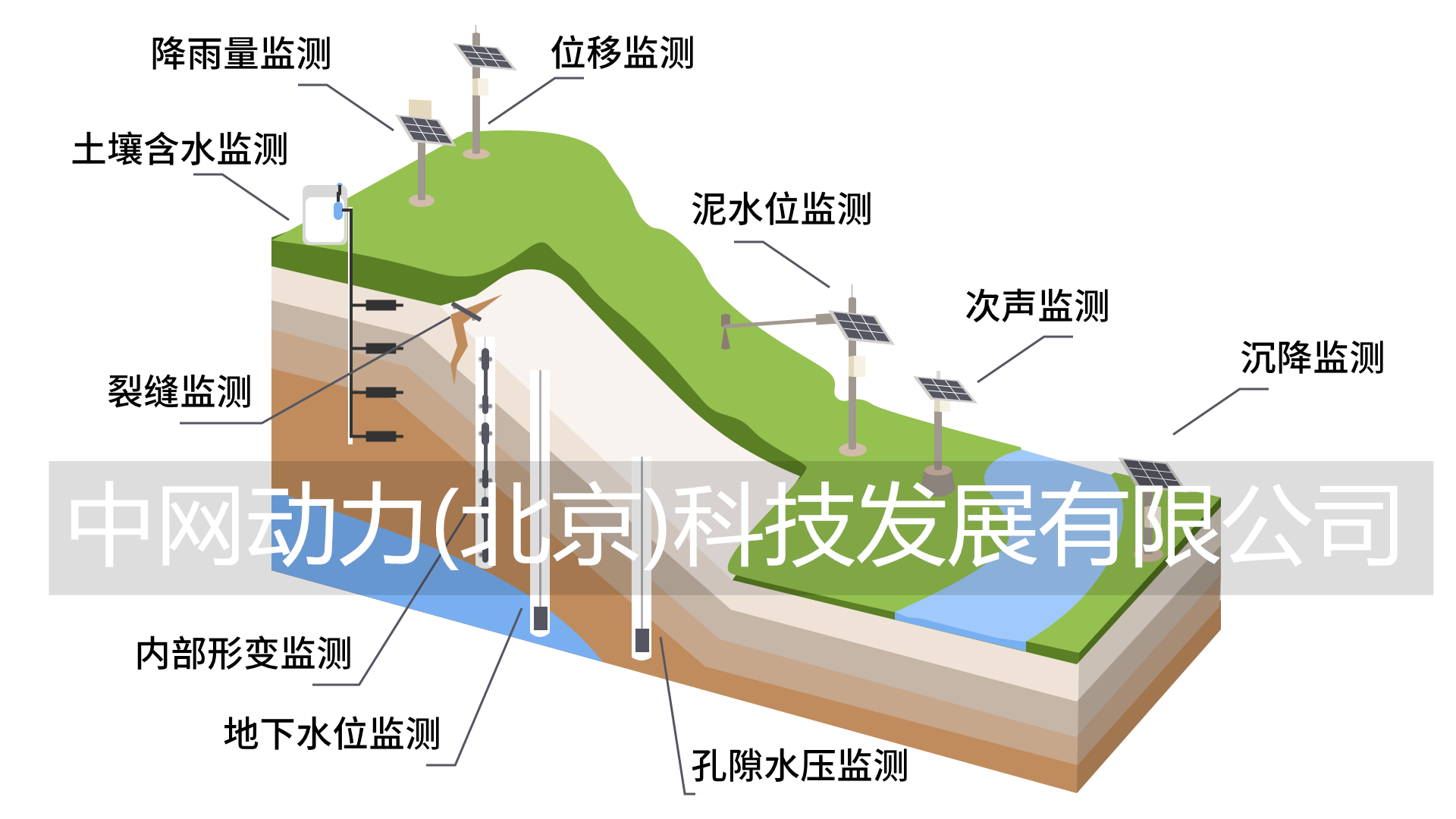 (1)数据感知:GNSS、沉降仪、孔隙水压计、渗压计、泥水位计、裂缝计、测斜仪、降雨(雪)、次声、土壤水分等参数;